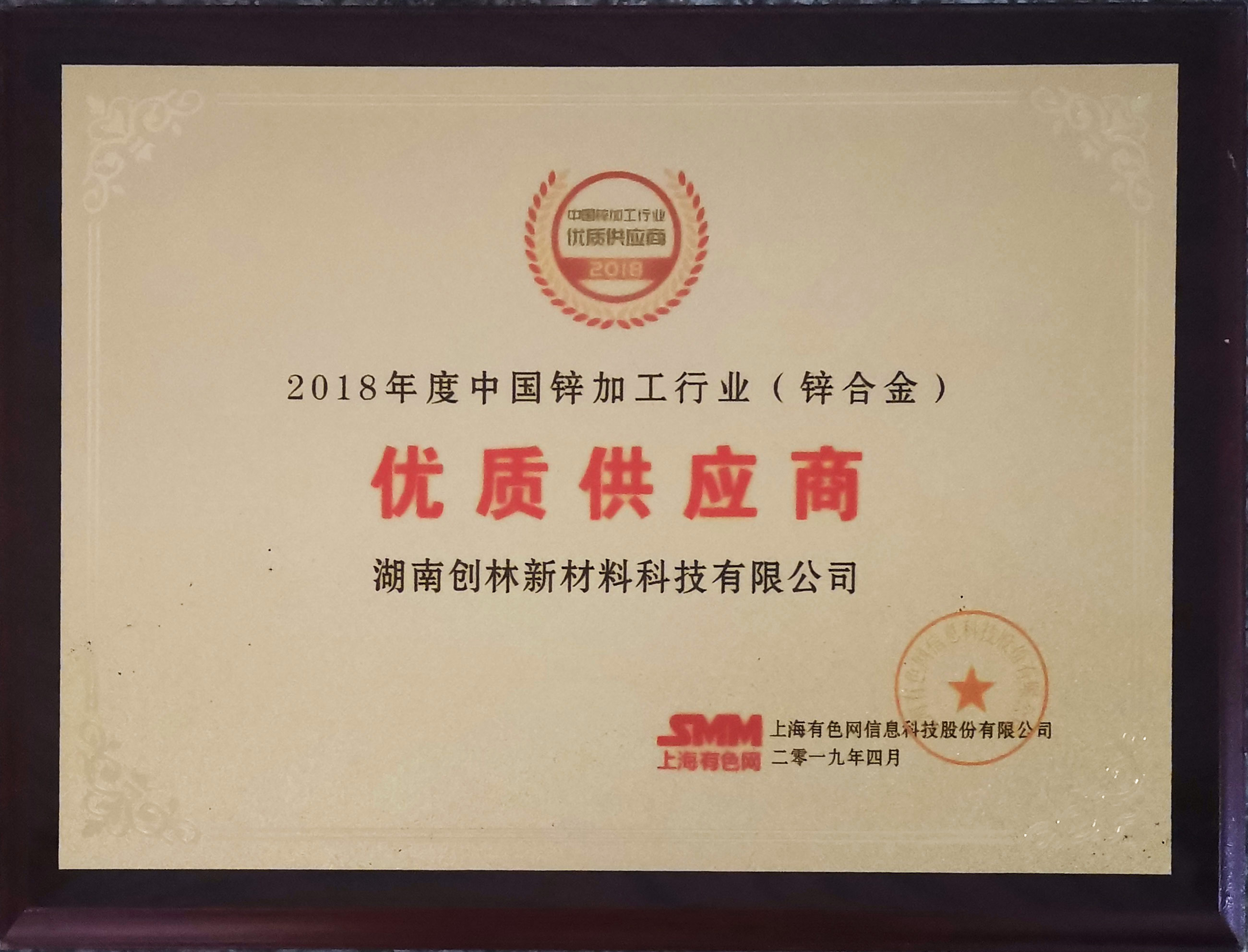 2018年度中國鋅加工行業(yè)優(yōu)質供應商
